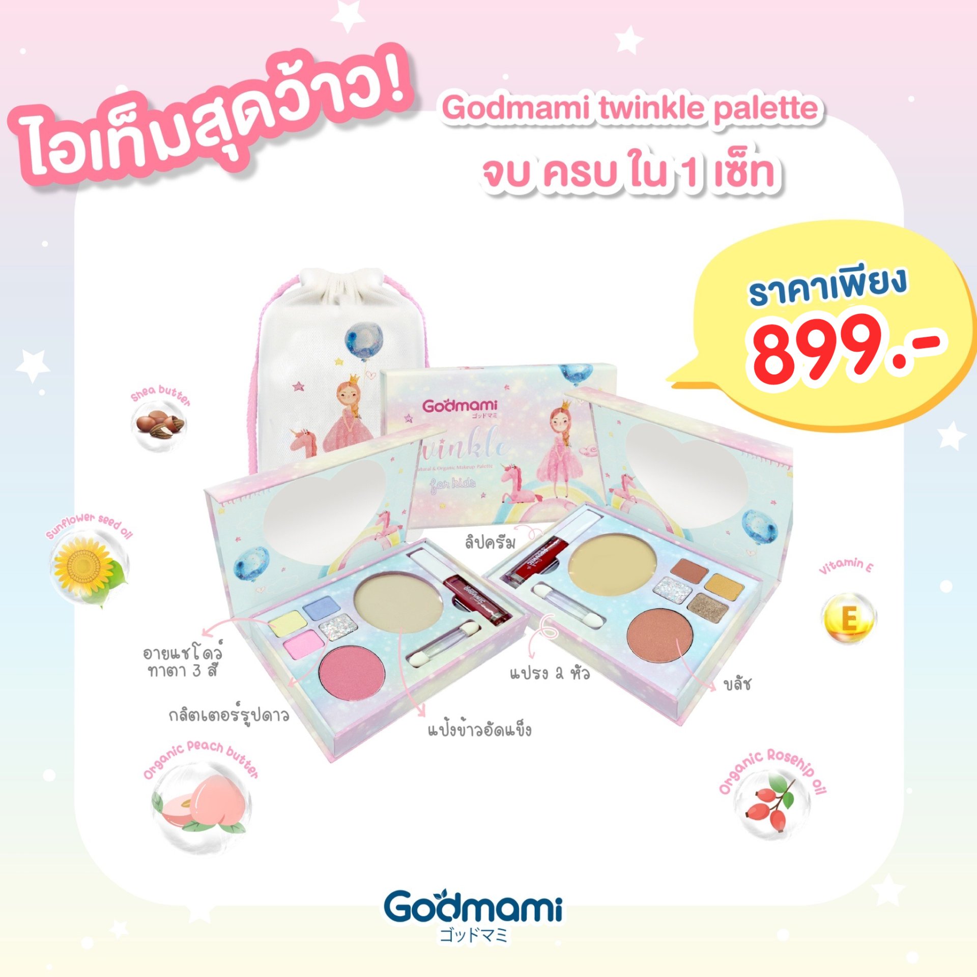 1 พาเลทท์ประกอบไปด้วย: อายแชโดว์ 3, บลัชออน 1 สี, กลิตเตอร์วิ้งๆ 1 สี, แป้งพัฟ (จากเมล็ดข้าว), ลิปครีม 1 แท่ง และ ถุงผ้า