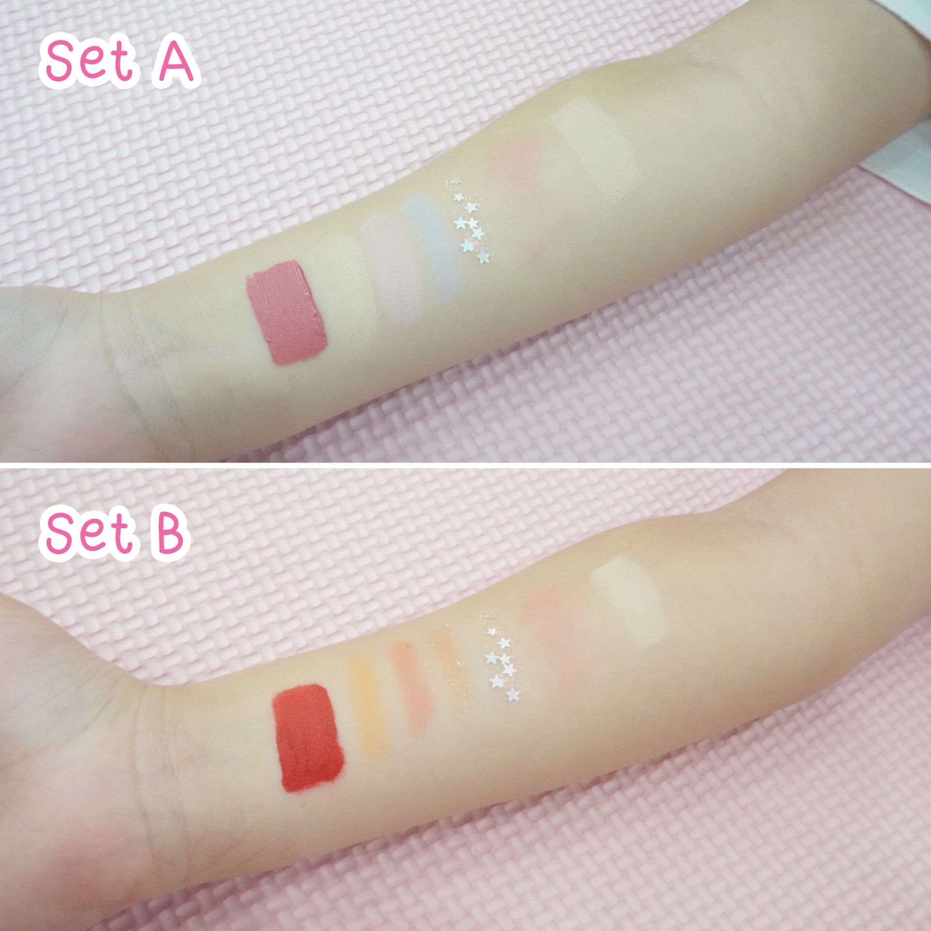 รายละเอียดเซ็ท A: อายแชโดว์ (สีเหลือง, สีม่วง, สีชมพู), บลัชออน (สี sweetie pink), กลิตเตอร์แต่งหน้า(ดาวสีเงินประกายชมพู)